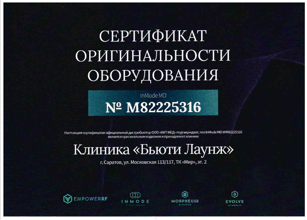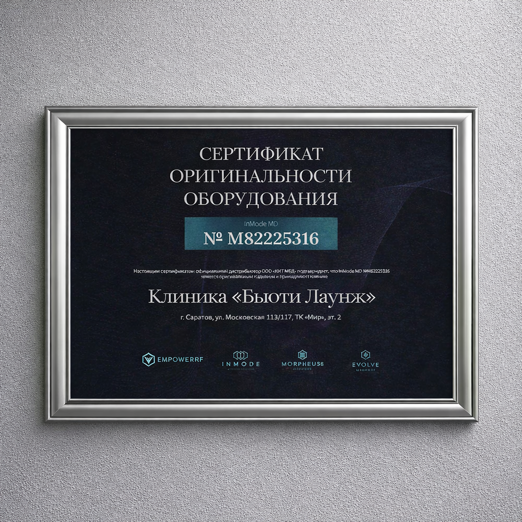В клинике красоты «Бьюти Лаунж» мы принципиально работаем только на оригинальном оборудовании — и теперь это подтверждено официально. Наша клиника получила сертификат подлинности аппарата InMode, выданный официальным дистрибьютором InMode в России — ООО «КИТ МЕД».