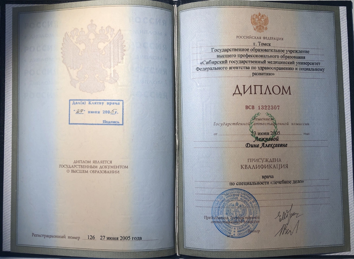 - Российский государственный медицинский университет, специальность «Лечебное дело», 2005.