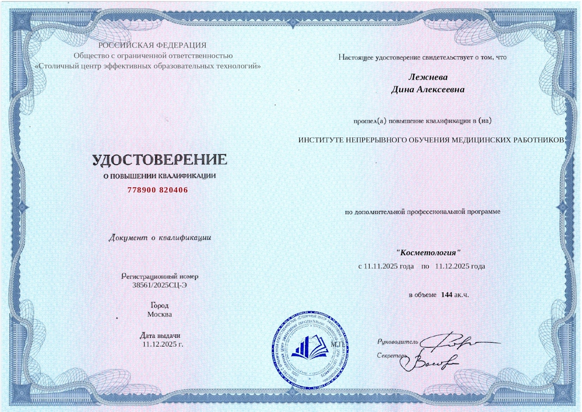 - Российский университет дружбы народов (РУДН), косметология 2012.
