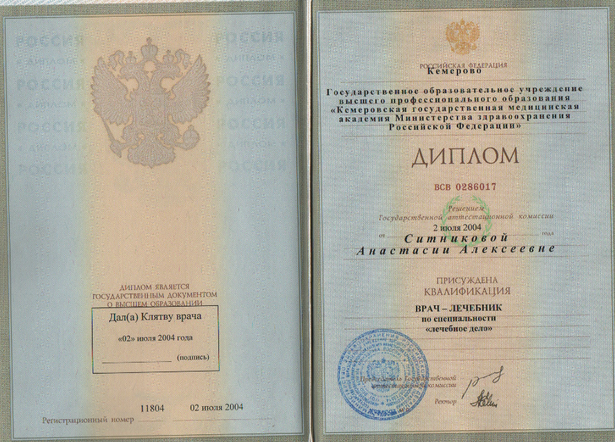- Кемеровская государственная медицинская академия Министерства здравоохранения РФ, специальность «Лечебное дело», 2004.