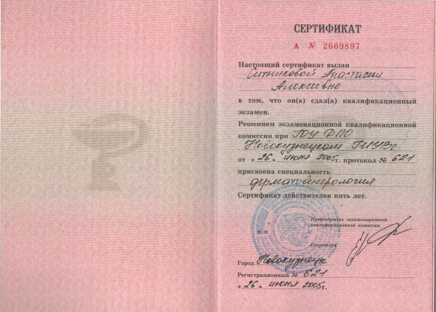 - Повышение квалификации по программе «Мезотерапия в дерматокосметологии», 2005.