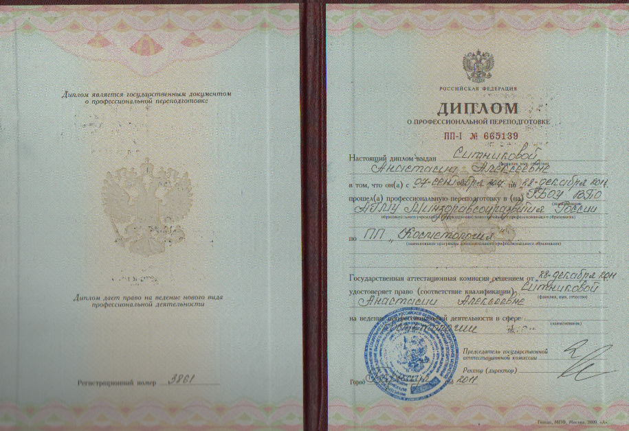 - Профессиональная переподготовка по специальности «Косметология», 2011.