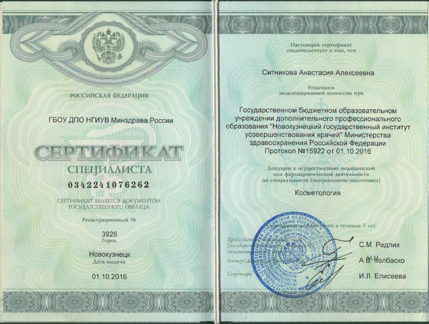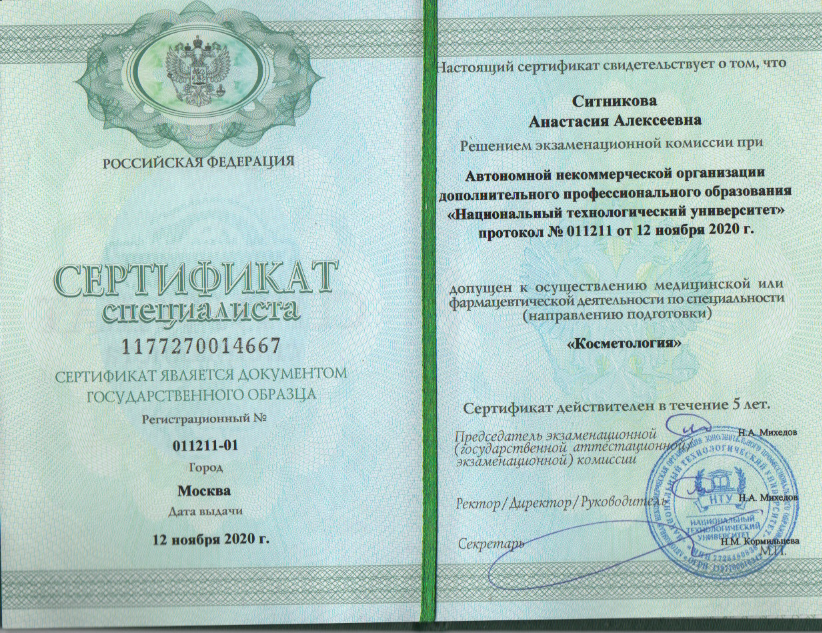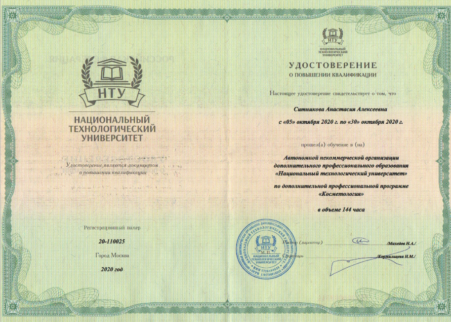 - Повышение квалификации по специальности «Косметология», 2011, 2016, 2020.