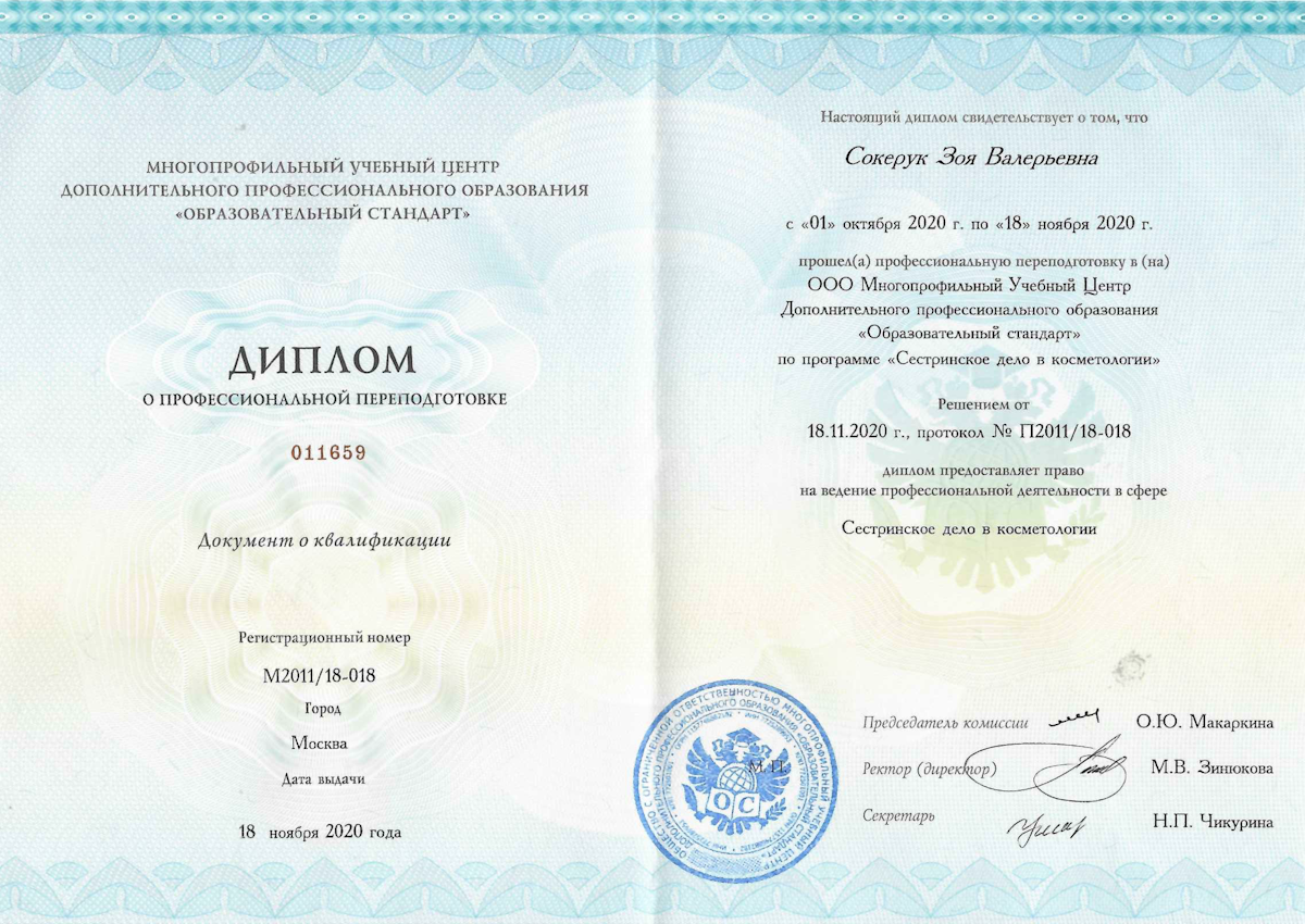 - Профессиональная переподготовка по специальности «Сестринское дело в косметологии»», 2020.