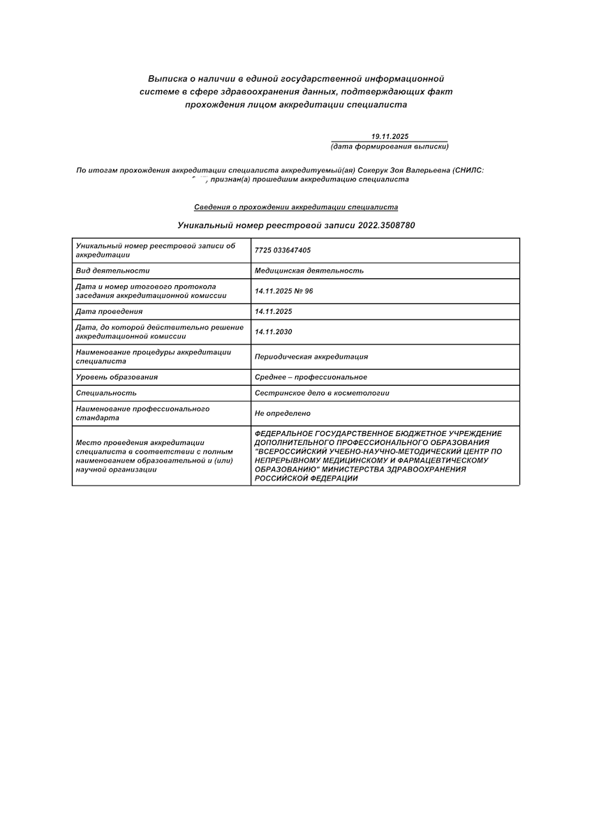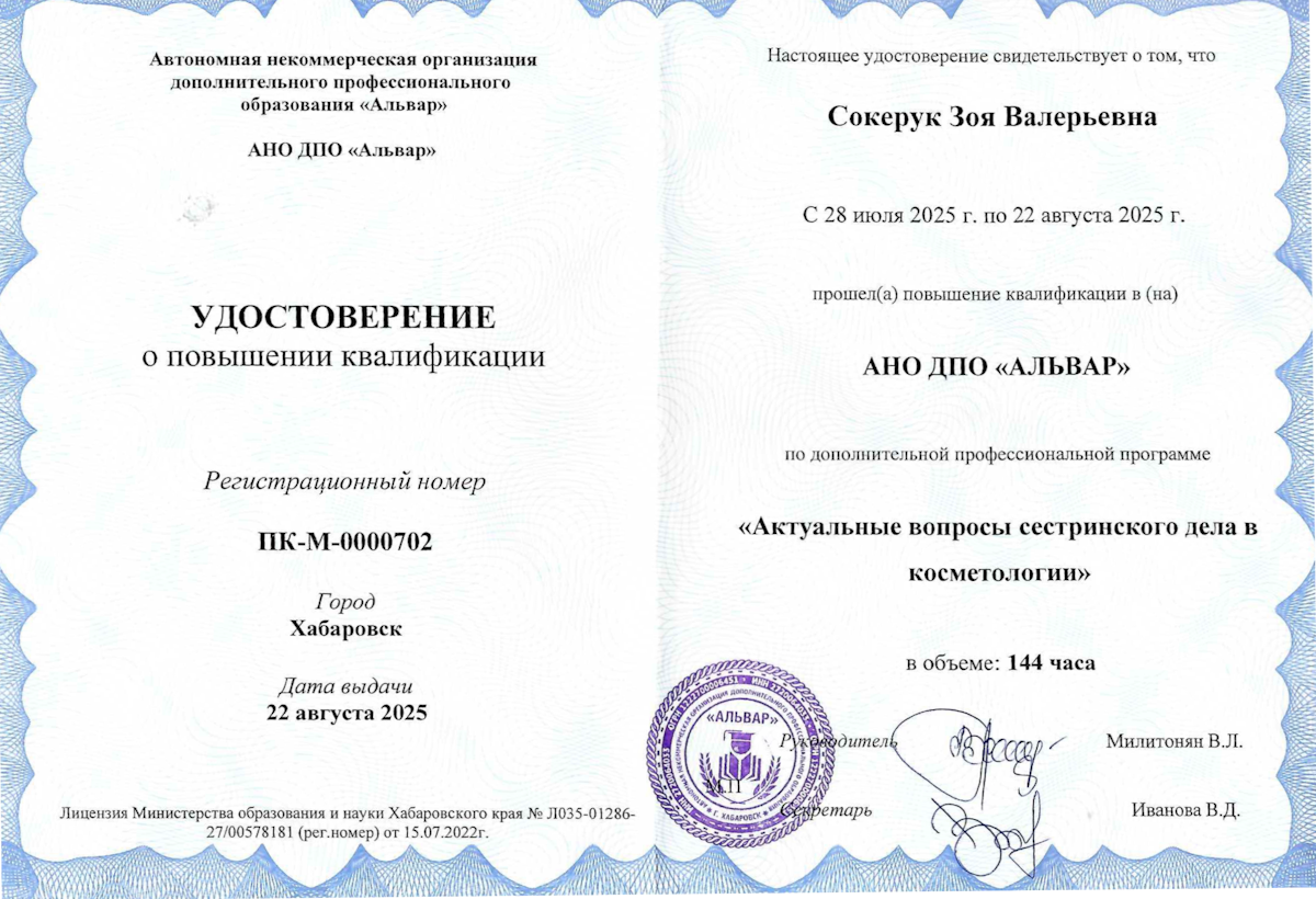 - Повышение квалификации по программе «Актуальные вопросы сестринского дела в косметологии», 2025.