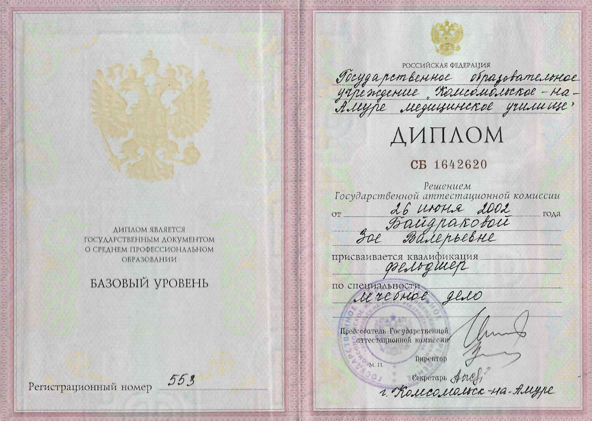 - Хабаровский государственный медицинский колледж «Лечебное дело», 2002.