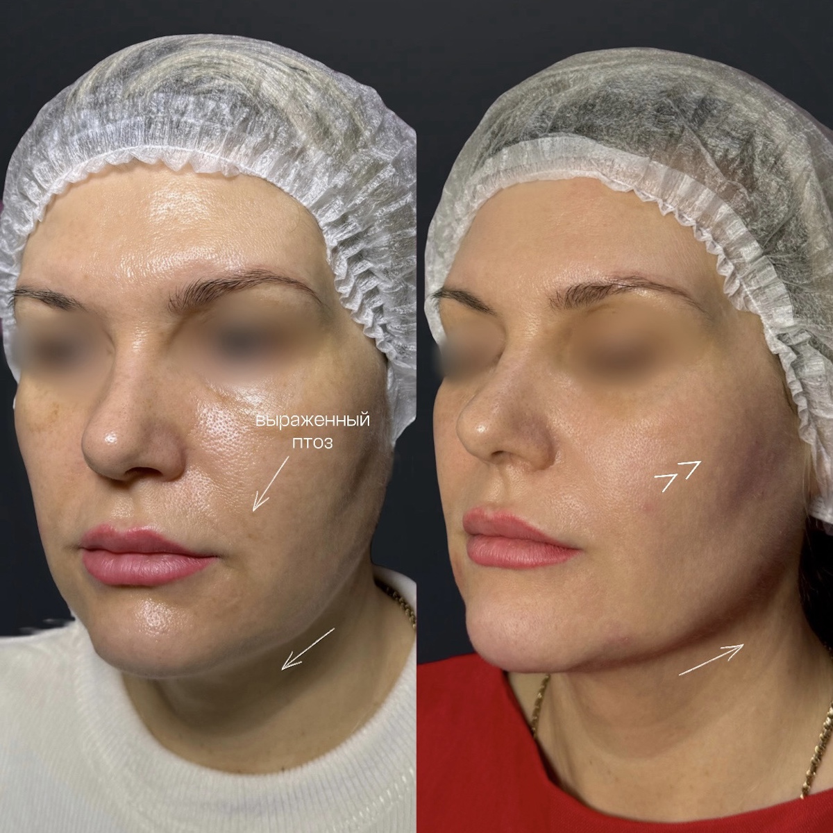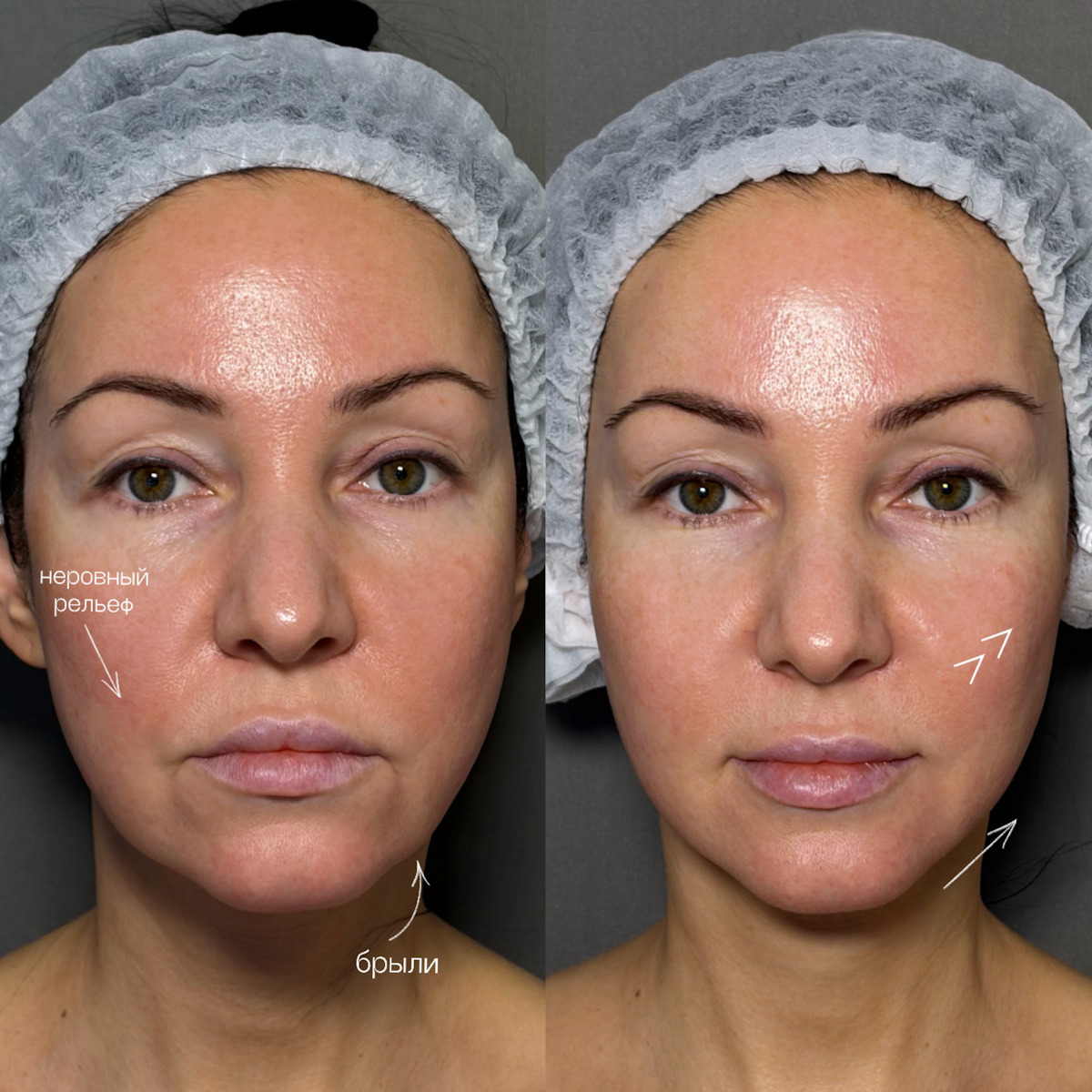 Расслабляет мышцы, которые тянут уголки губ вниз и формируют складки. Защищает результат филлеров от «сминания».