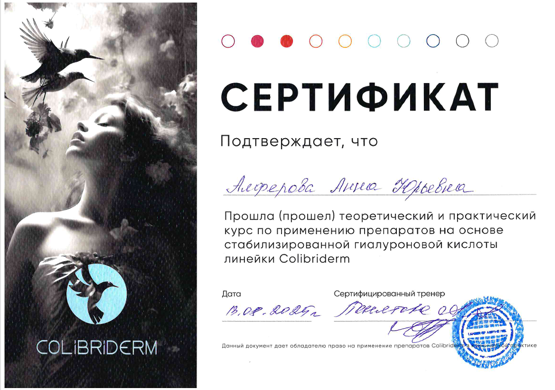 - Повышение квалификации по специальности «Косметология», 2019, 2024.