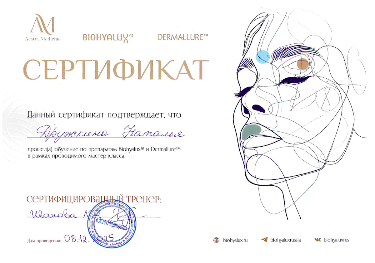- Повышение квалификации по программе «Современные лазерные технологии в дерматологии и косметологии», 2023.