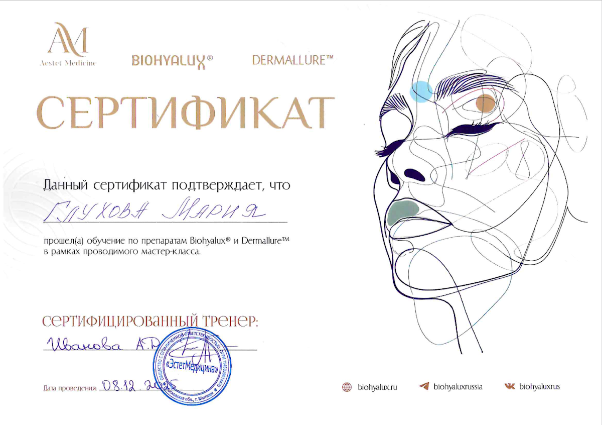 - Повышение квалификации по программе «Современные лазерные технологии в косметологии», 2022.