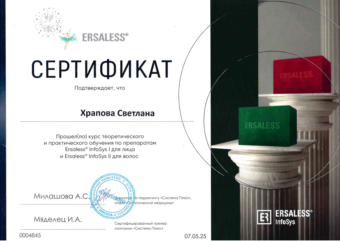 - Повышение квалификации по программе «Современные лазерные технологии в дерматовенерологии и косметологии», 2021.