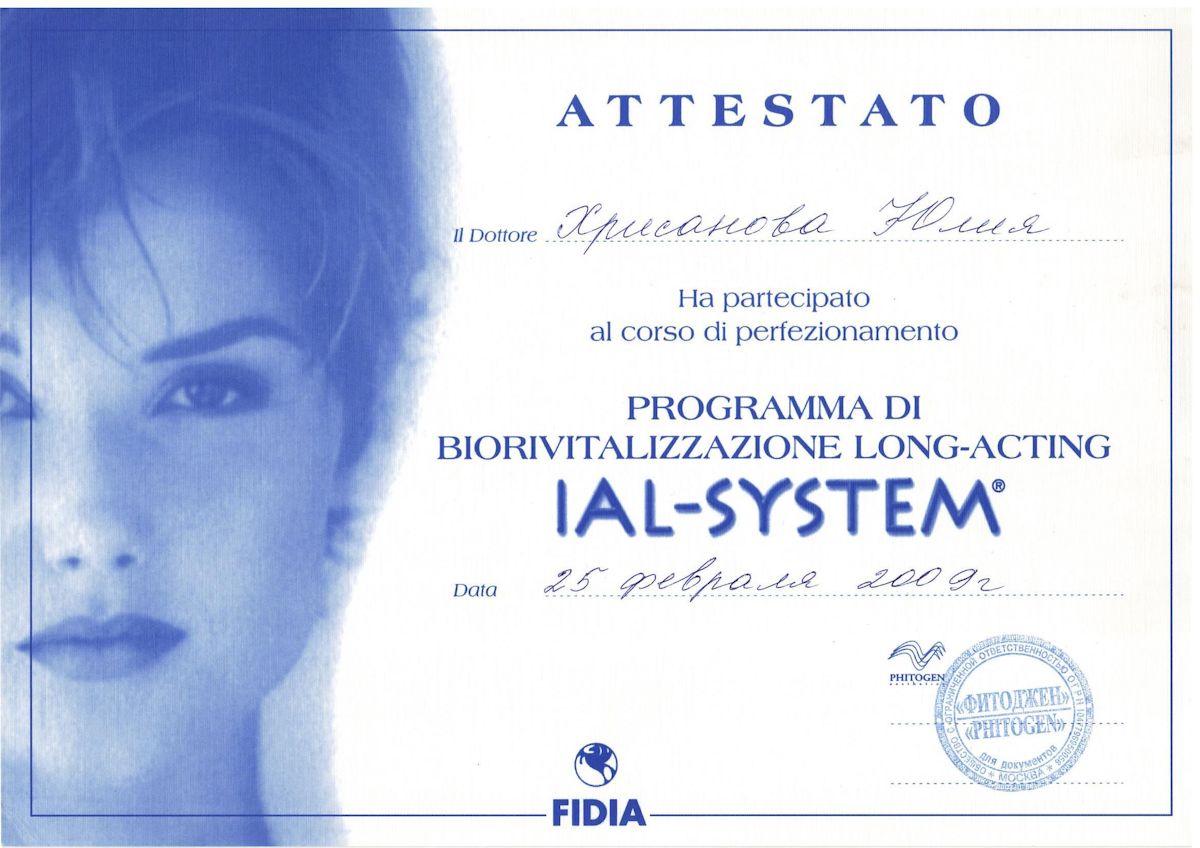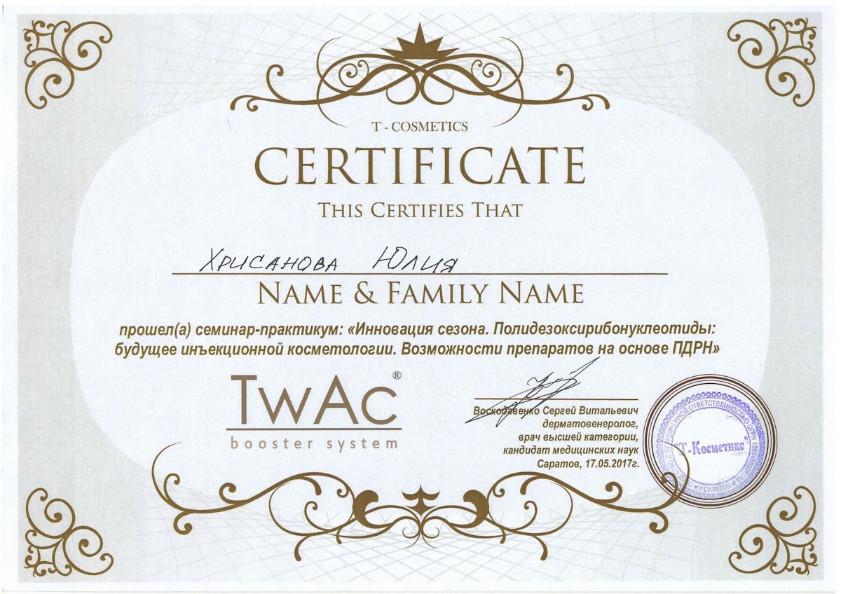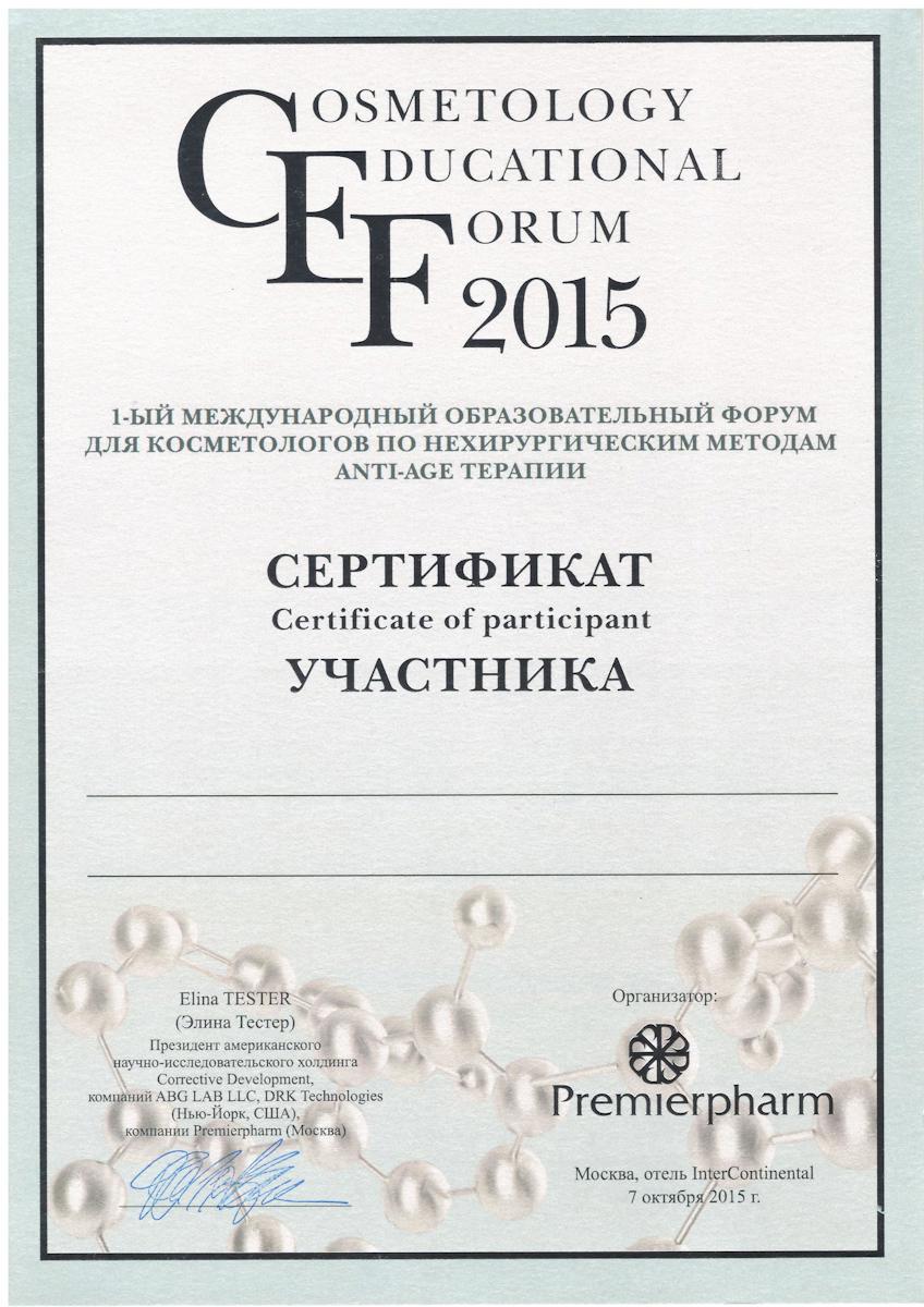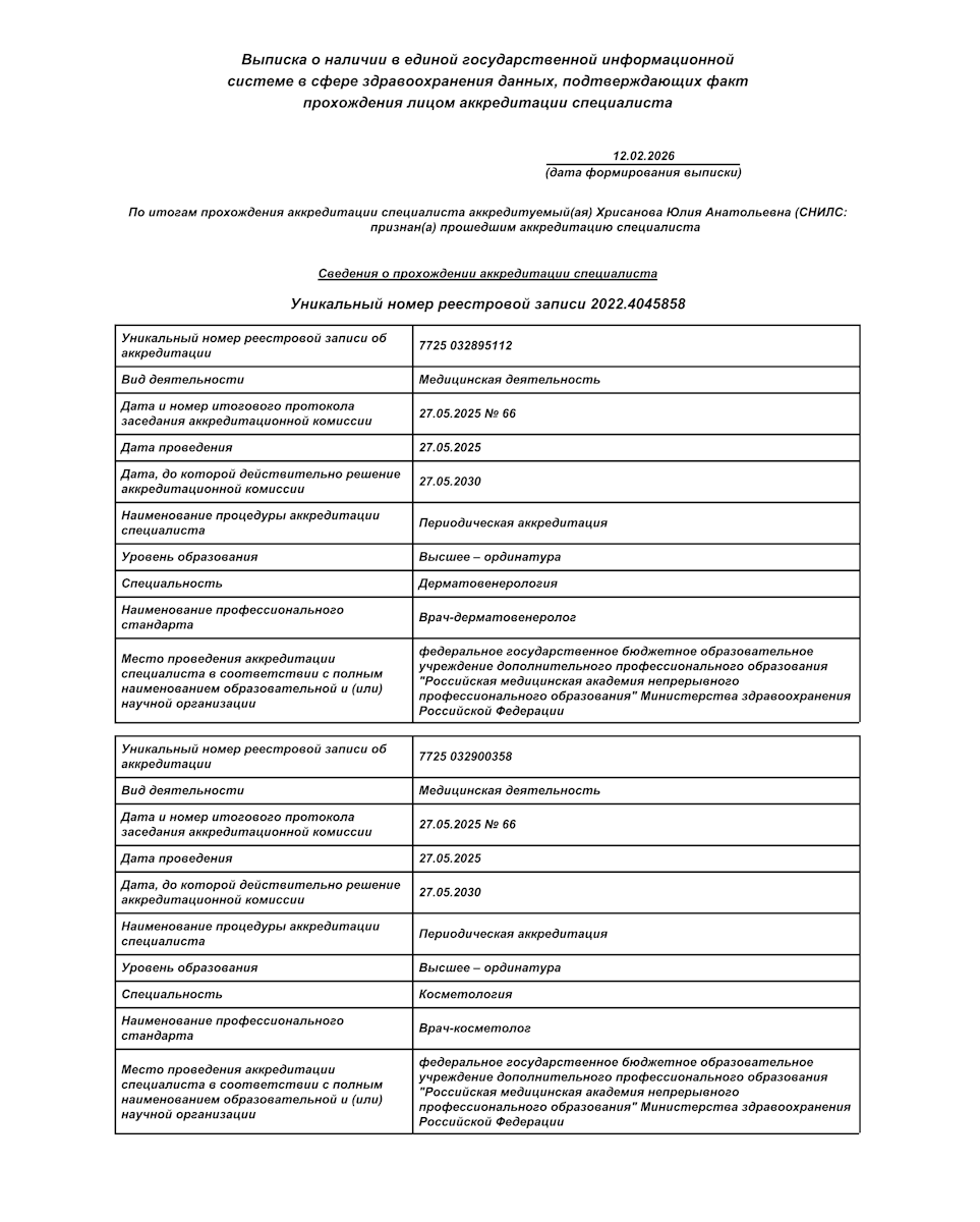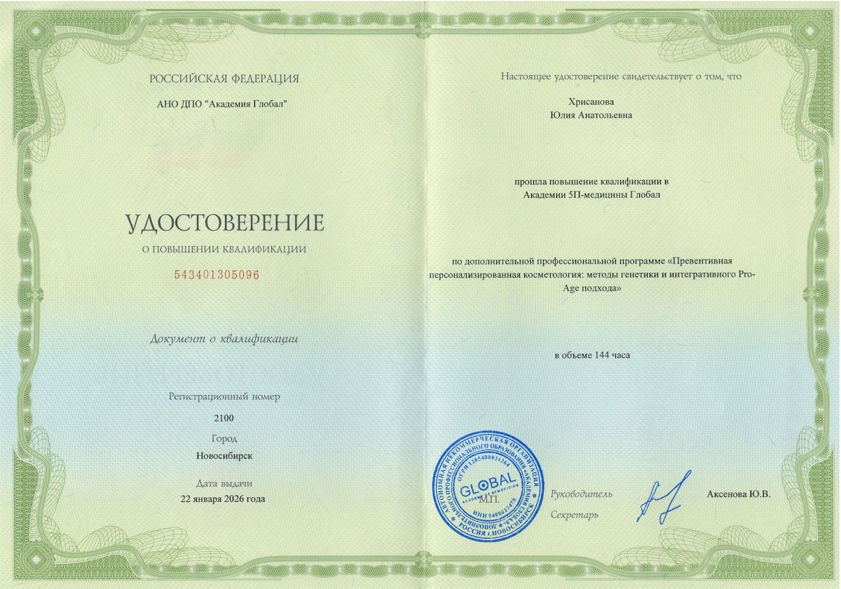 - Повышение квалификации по программе «Превентивная персонализированная косметология: методы генетики и интегративного Pro-Age подхода», 2026.