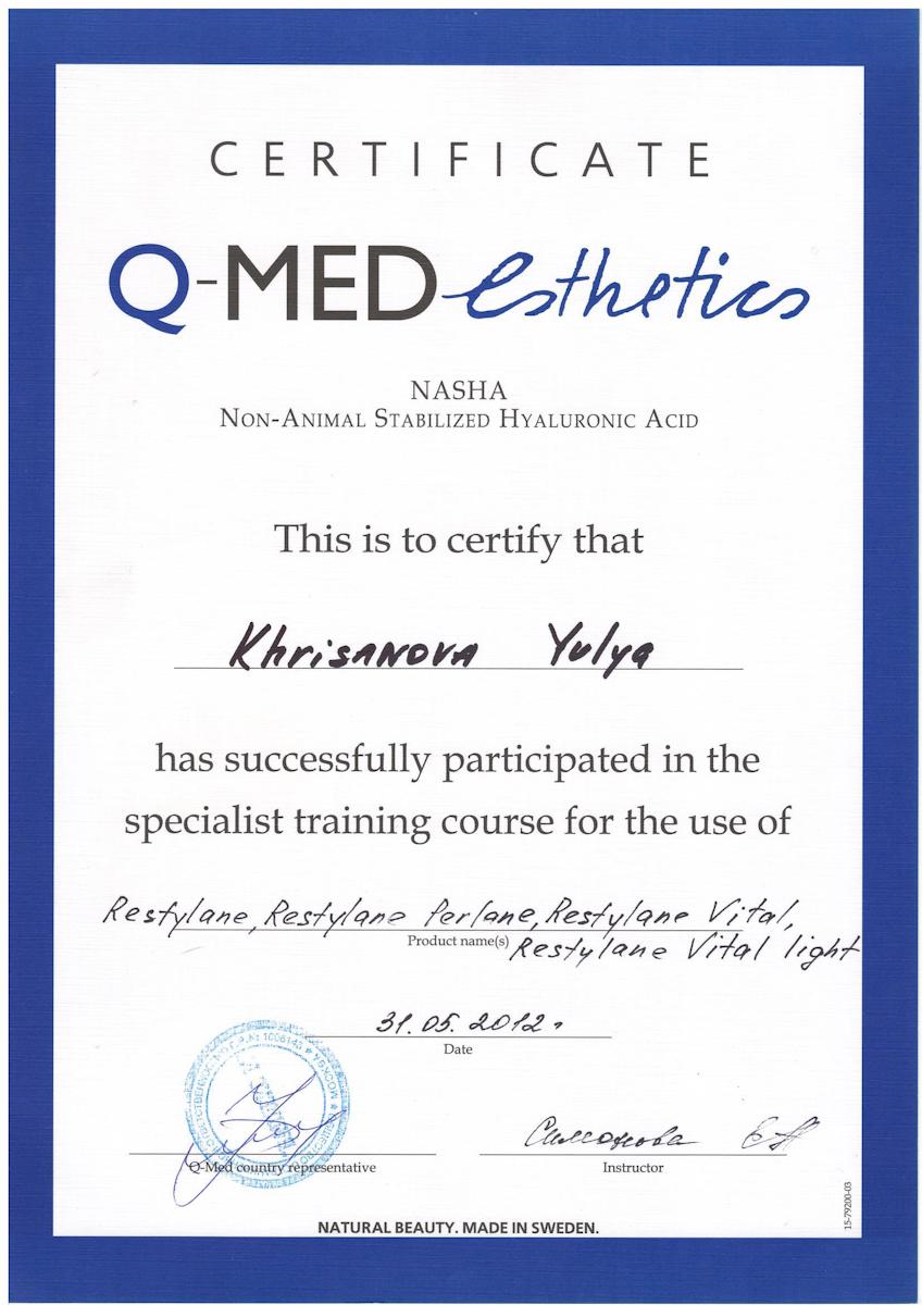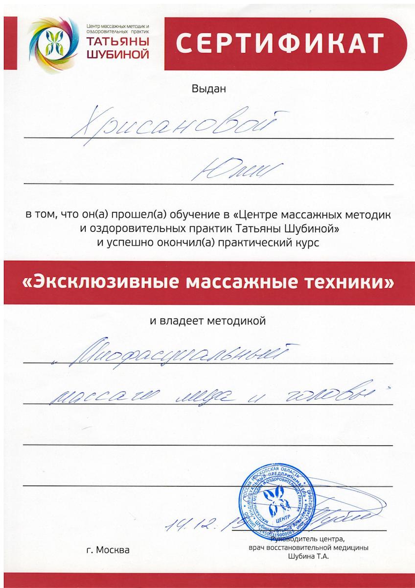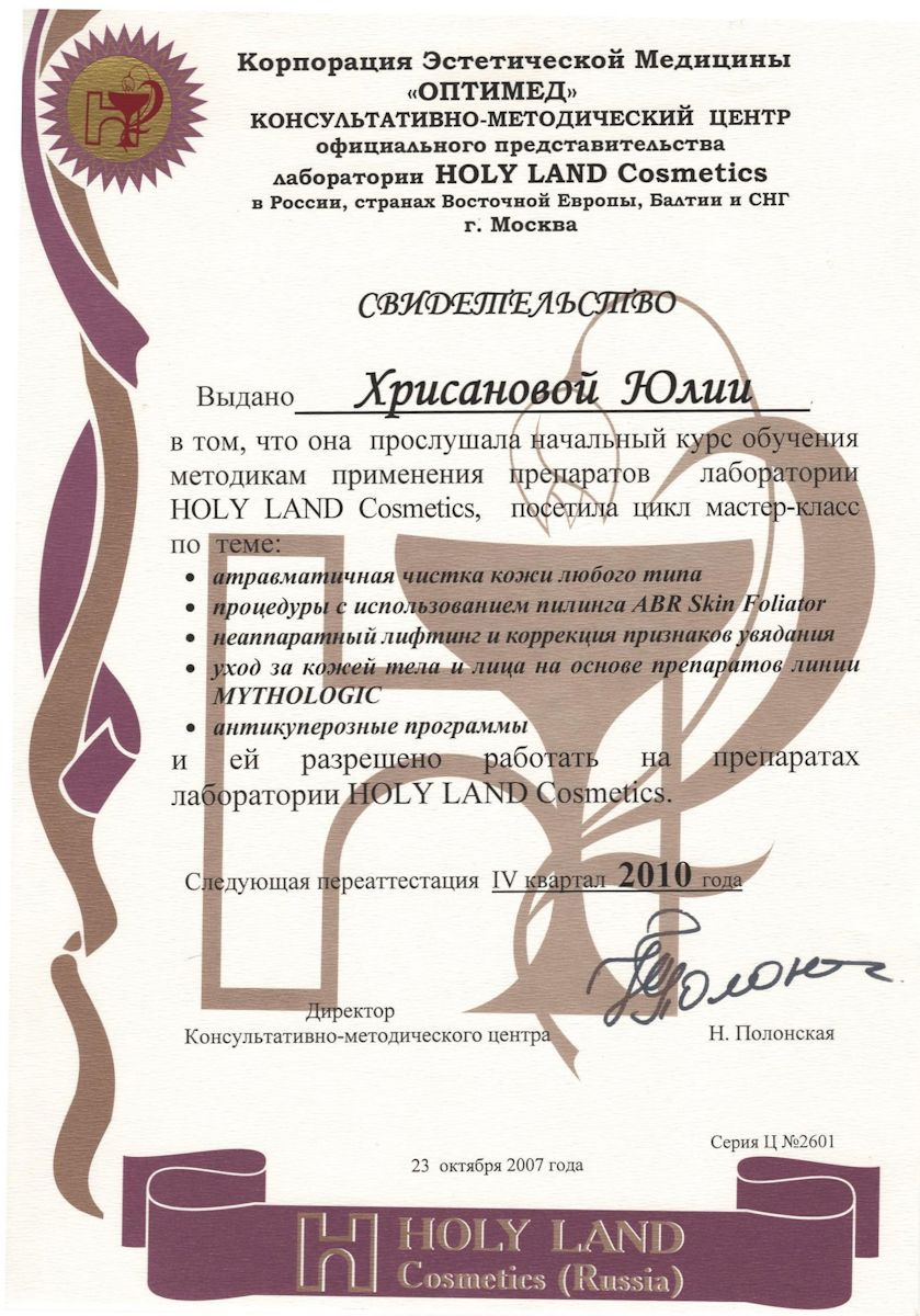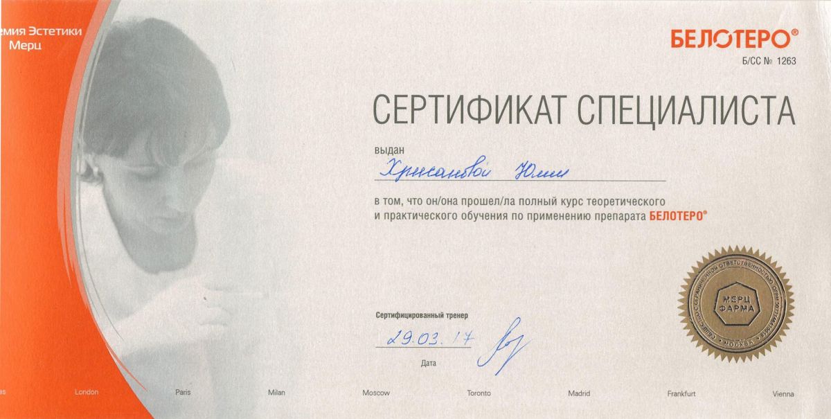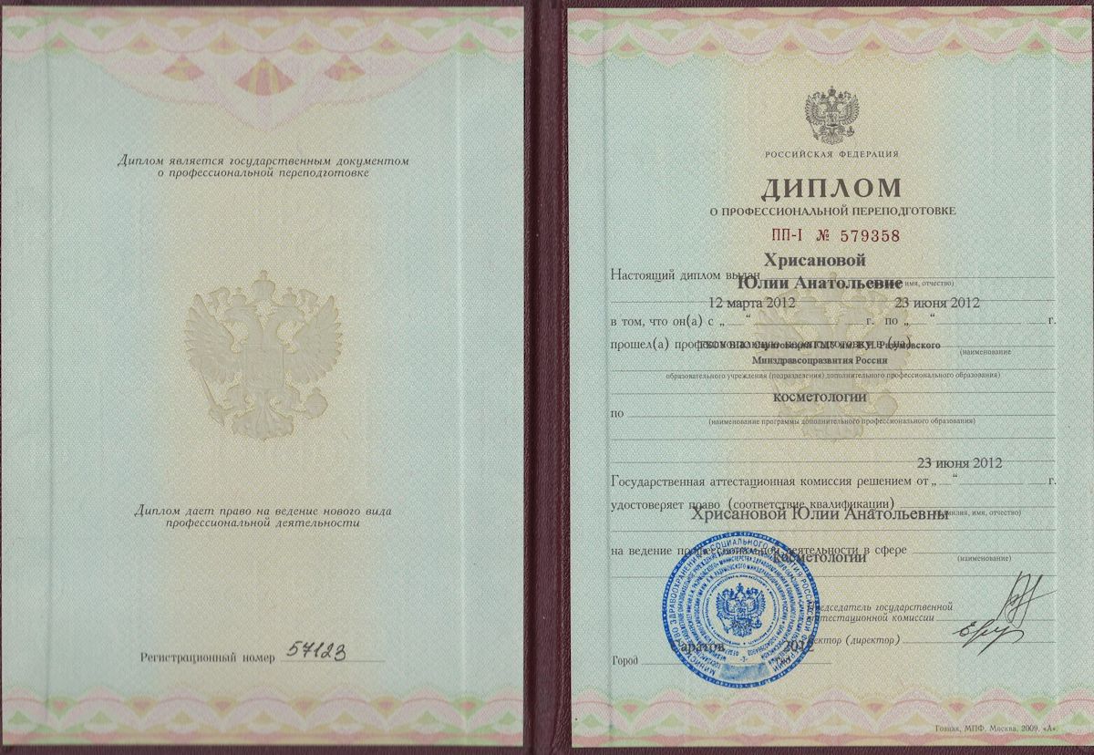 - Профессиональная переподготовка по специальности «Косметология», 2012.