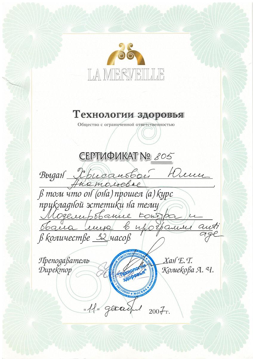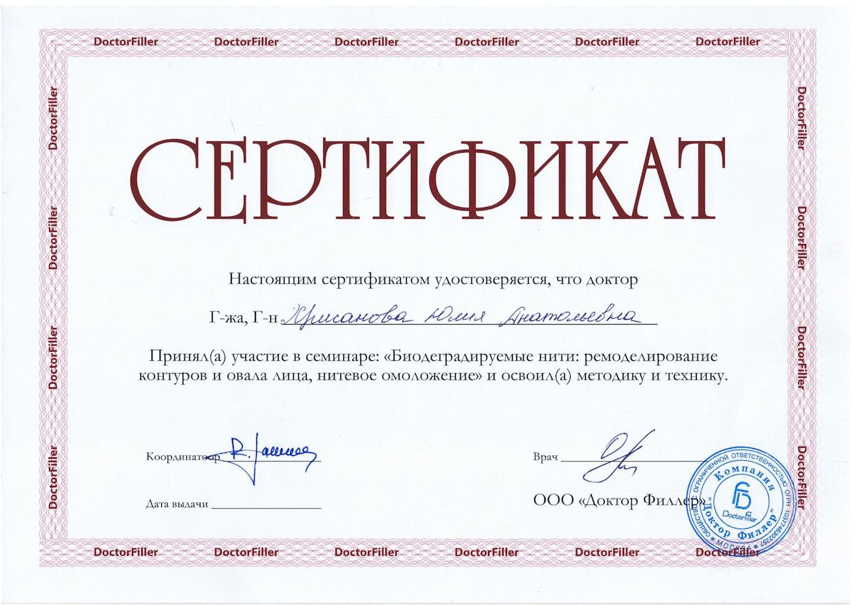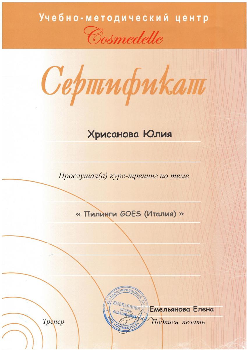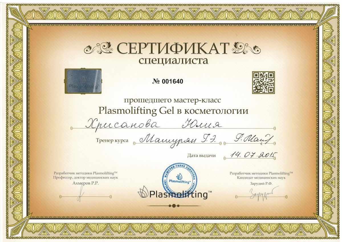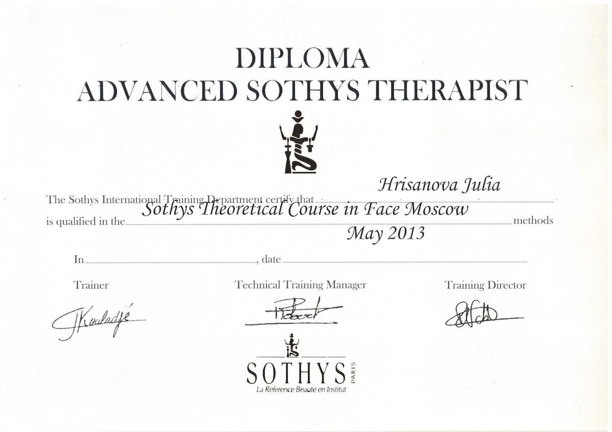 - Профессиональная переподготовка по специальности «Косметология», 2012.