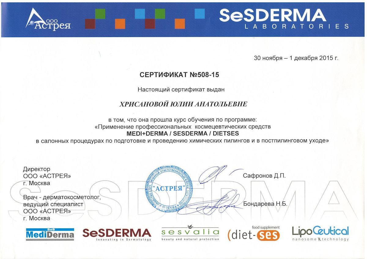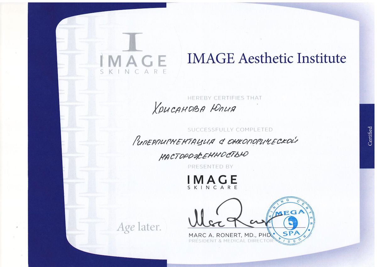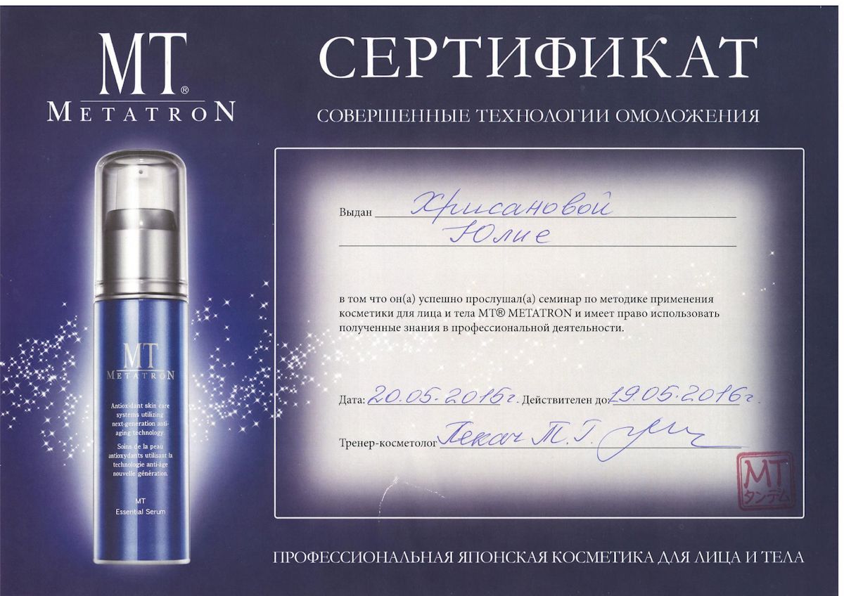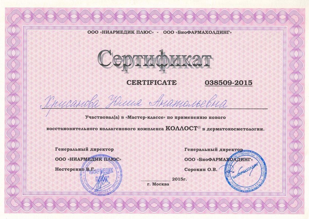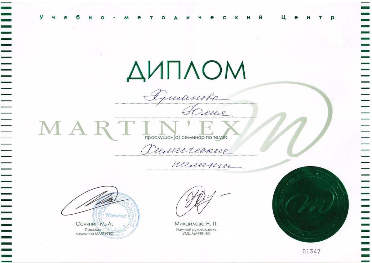 - Профессиональная переподготовка по специальности «Косметология», 2012.