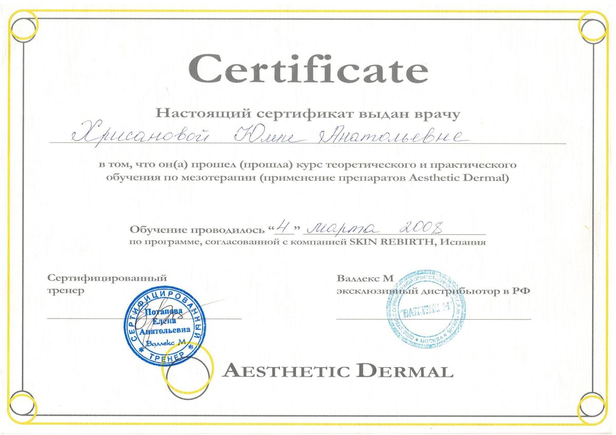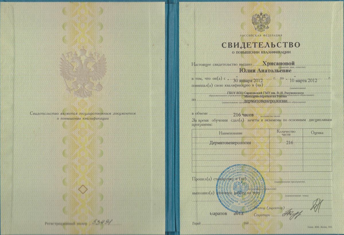 - Повышение квалификации по специальности «Дерматовенерология», 2012.
