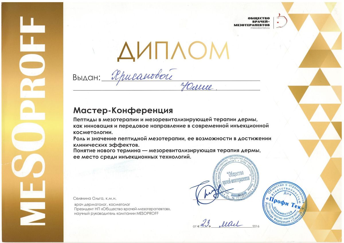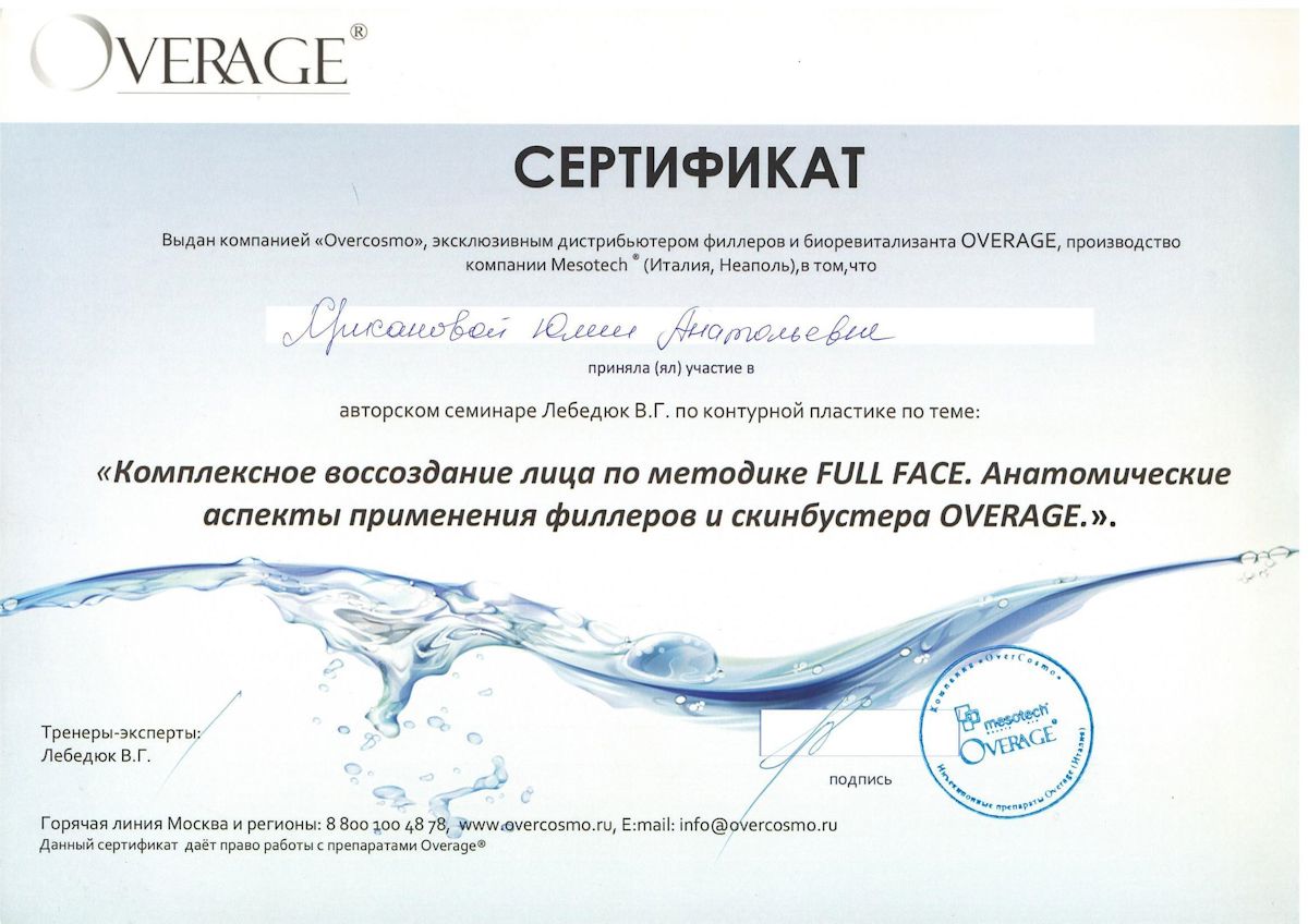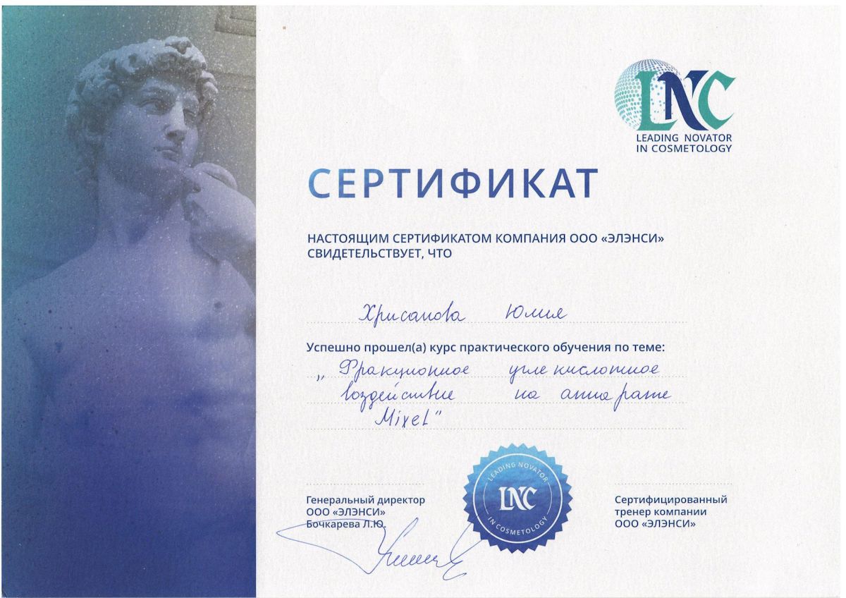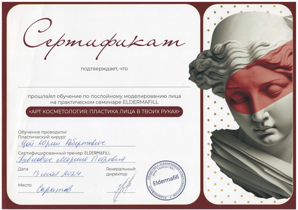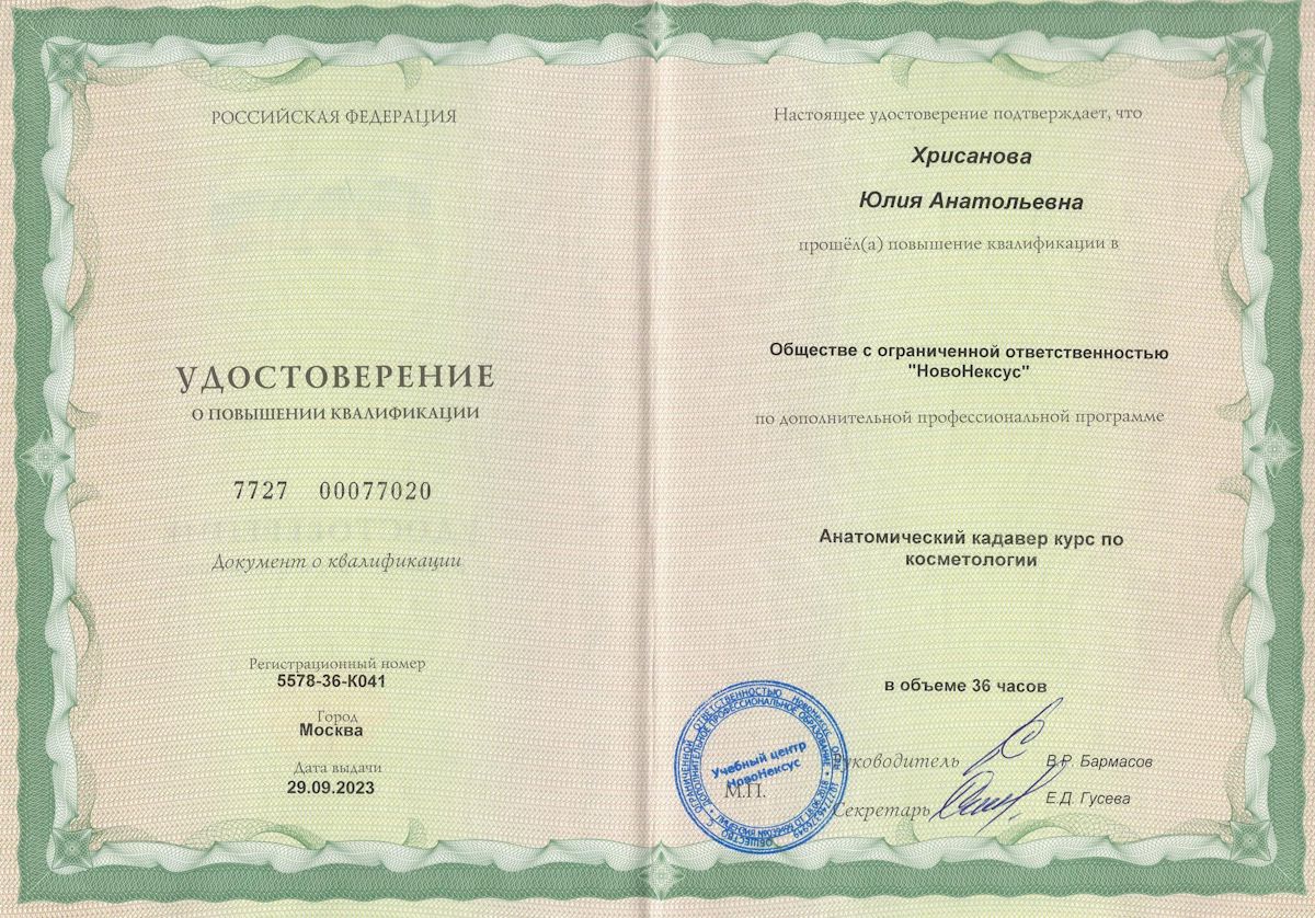 - Повышение квалификации по программе «Анатомический кадавер курс по косметологии», 2023.