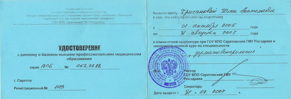 - Ординатура по специальности «Дерматовенерология», 2007.