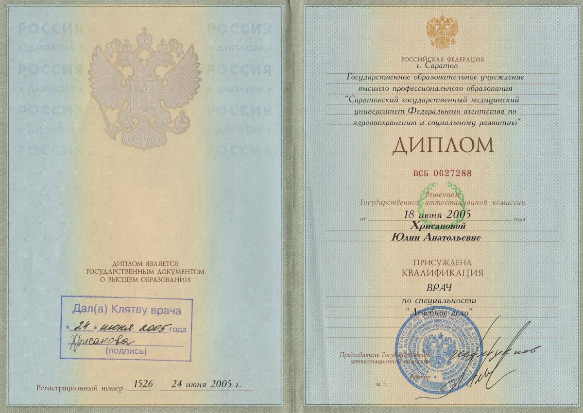 - Саратовский Государственный Медицинский Университет им. В.И. Разумовского, специальность «Лечебное дело», 2005.