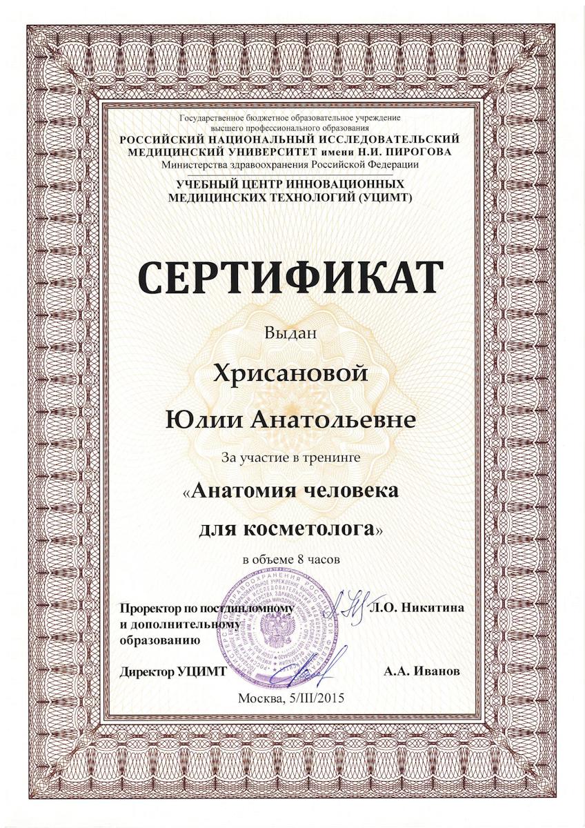 - Повышение квалификации по программе «Анатомические особенности строения головы и шеи в практике применения инъекционных методов коррекции», 2024.