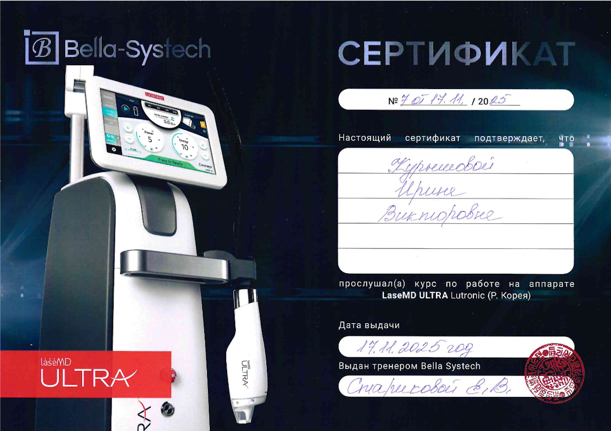 - Обучение работе на аппаратах LaseMD Ultra, Stellar M22, Fotona, PicoSure, Volnewmer, MJoule BBL HERO, M22, InMode, Ulthera System, Ultraformer MPT, DEKA SmartXide 2, Exilis Ultra 360, Liftera A, Scarlet-S RF, HydraFacial MD, Guinot Hydraderm, Harmonia LED PRO.