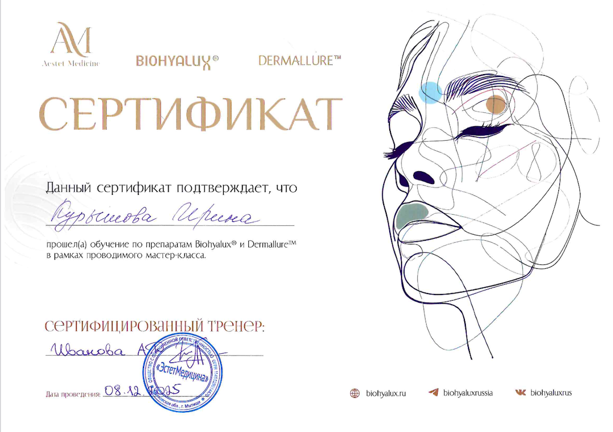 - Повышение квалификации по программе «Современные лазерные технологии в дерматологии и косметологии», 2023.