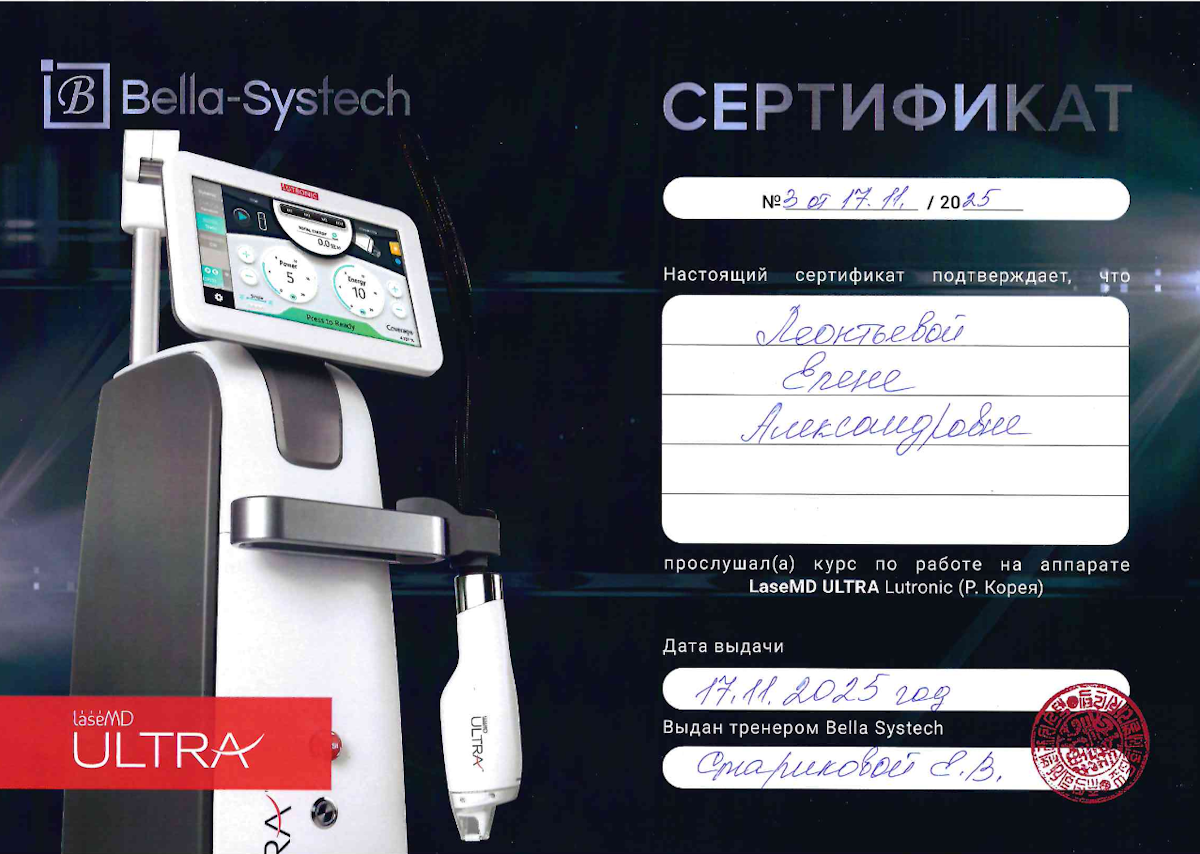 - Обучение работе на аппаратах LaseMD Ultra, Stellar M22, Fotona, PicoSure, Volnewmer, MJoule BBL HERO, M22, Eufoton, InMode, Ulthera System, Ultraformer MPT, Liftera A, Scarlet-S RF, HydraFacial MD, Guinot Hydraderm, Harmonia LED PRO.