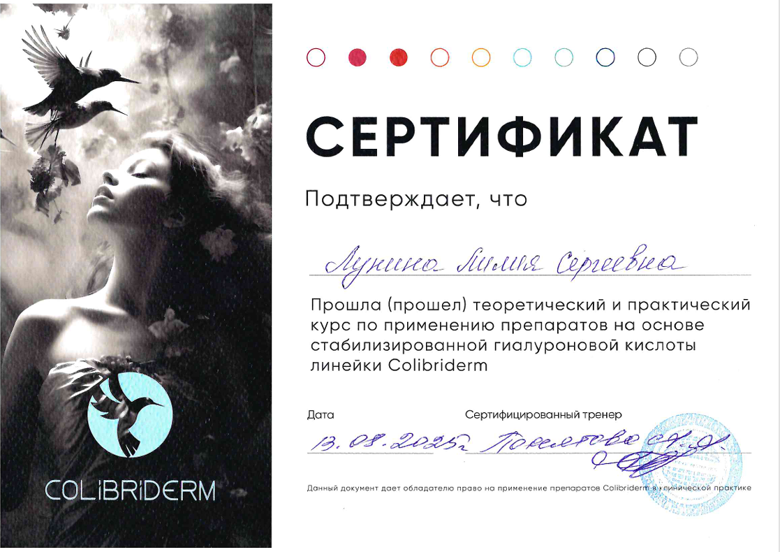 - Профессиональная переподготовка по специальности «Косметология», 2022.