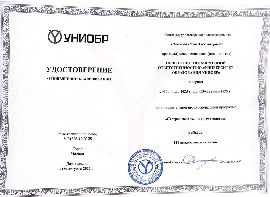 - Повышение квалификации по специальности «Сестринское дело в косметологии», 2020.