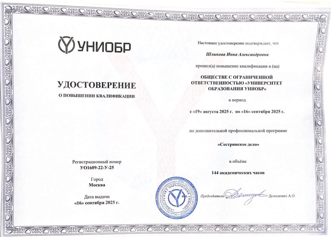 - Профессиональная переподготовка по специальности «Сестринское дело», 2020.