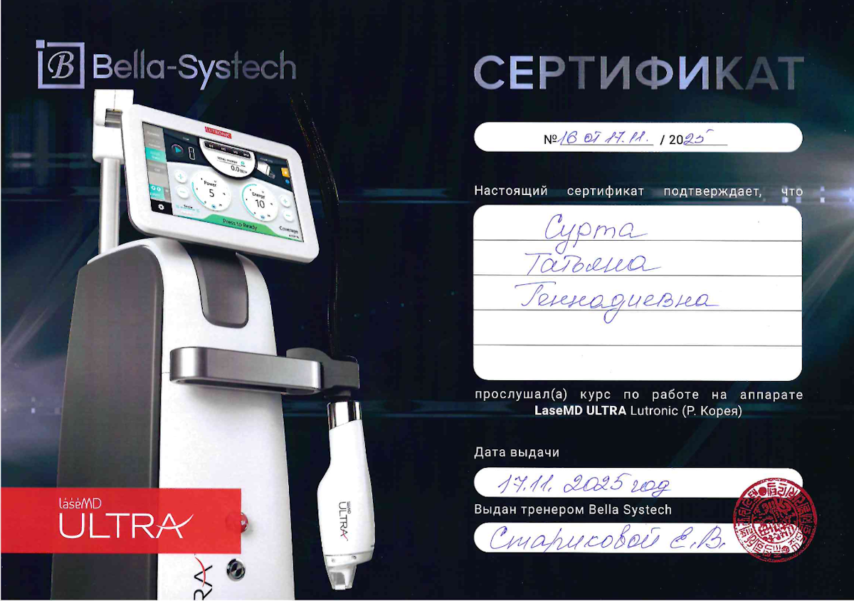 - Обучение работе на аппаратах LaseMD Ultra, PicoSure, DEKA SmartXide 2, Exilis Ultra 360, Emsella.