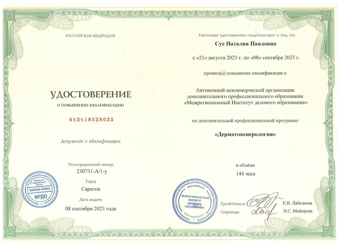 - Повышение квалификации по специальности «Дерматовенерология», 2016, 2023.