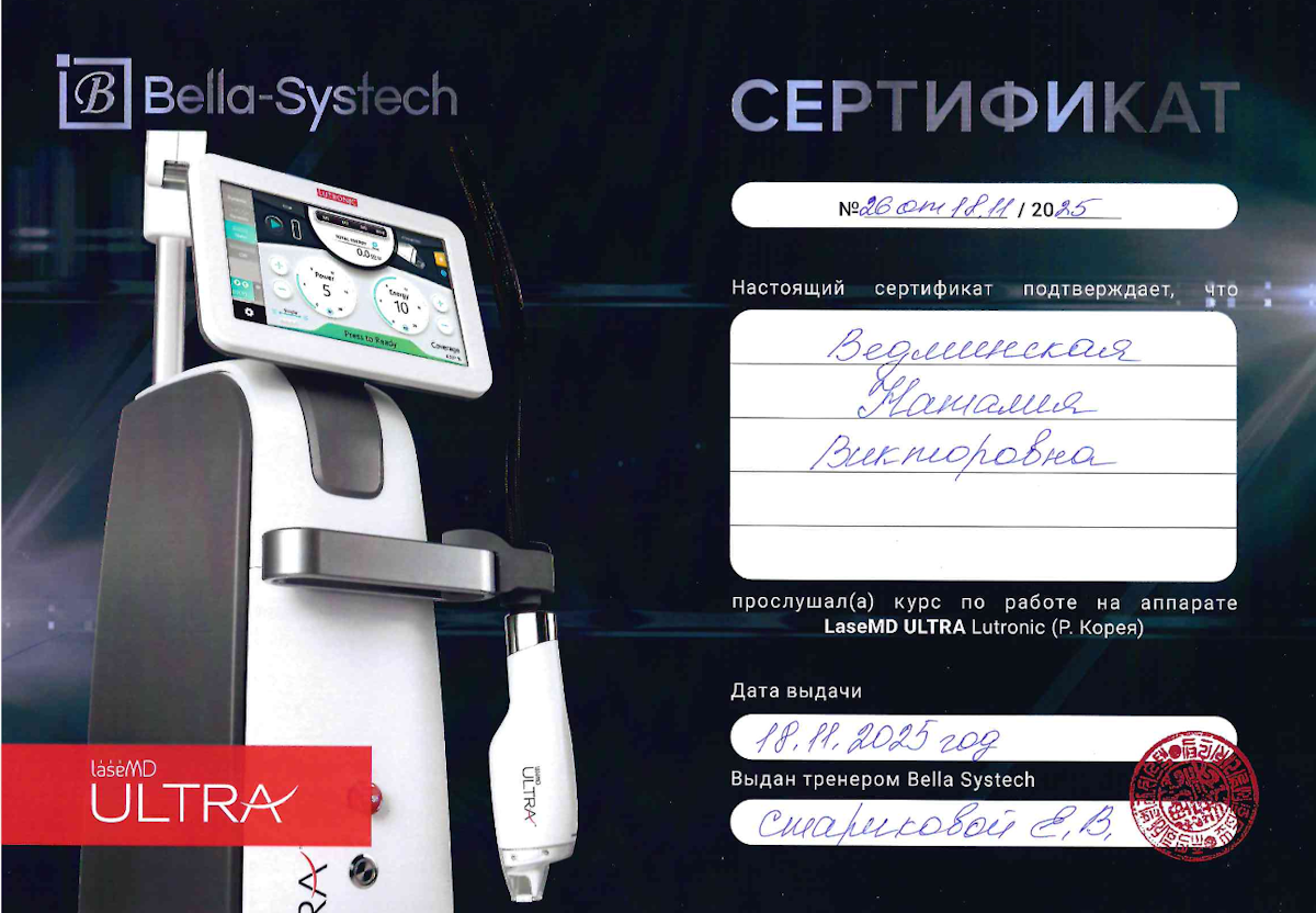 - Обучение работе на аппаратах LaseMD Ultra, Stellar M22, Fotona, PicoSure, Volnewmer, MJoule BBL HERO, M22, InMode, Ulthera System, Ultraformer MPT, HydraFacial MD, Guinot Hydraderm, Surgitron, Harmonia LED PRO.