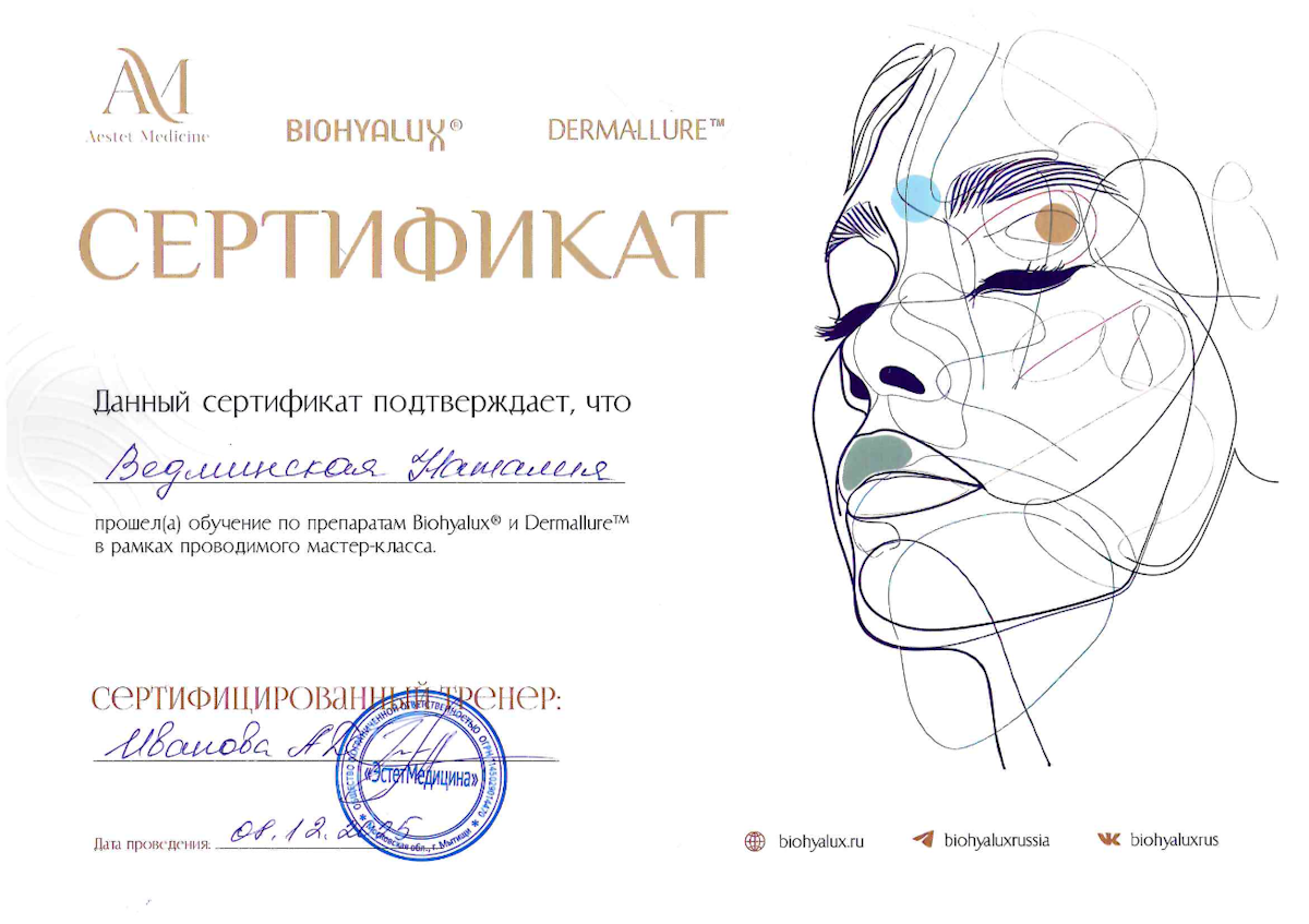 - Повышение квалификации по программе «Современные лазерные технологии в дерматологии и косметологии», 2023.