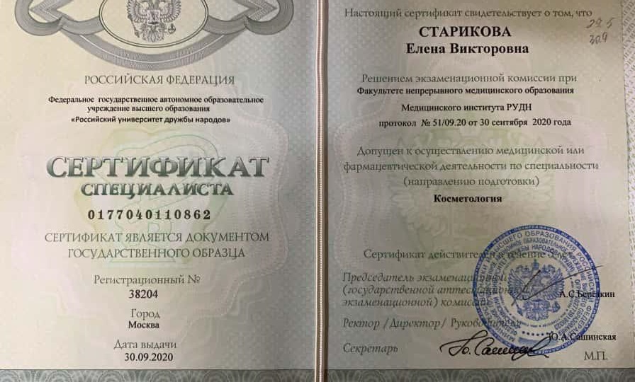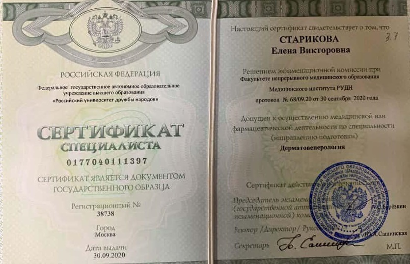- Повышение квалификации по программе «Дерматовенерология», 2020.