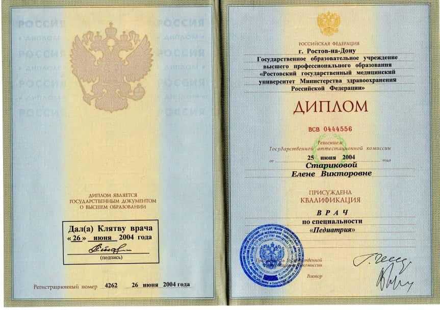 - Ростовский Государственный Медицинский Университет, специальность «Педиатрия», 2004.
