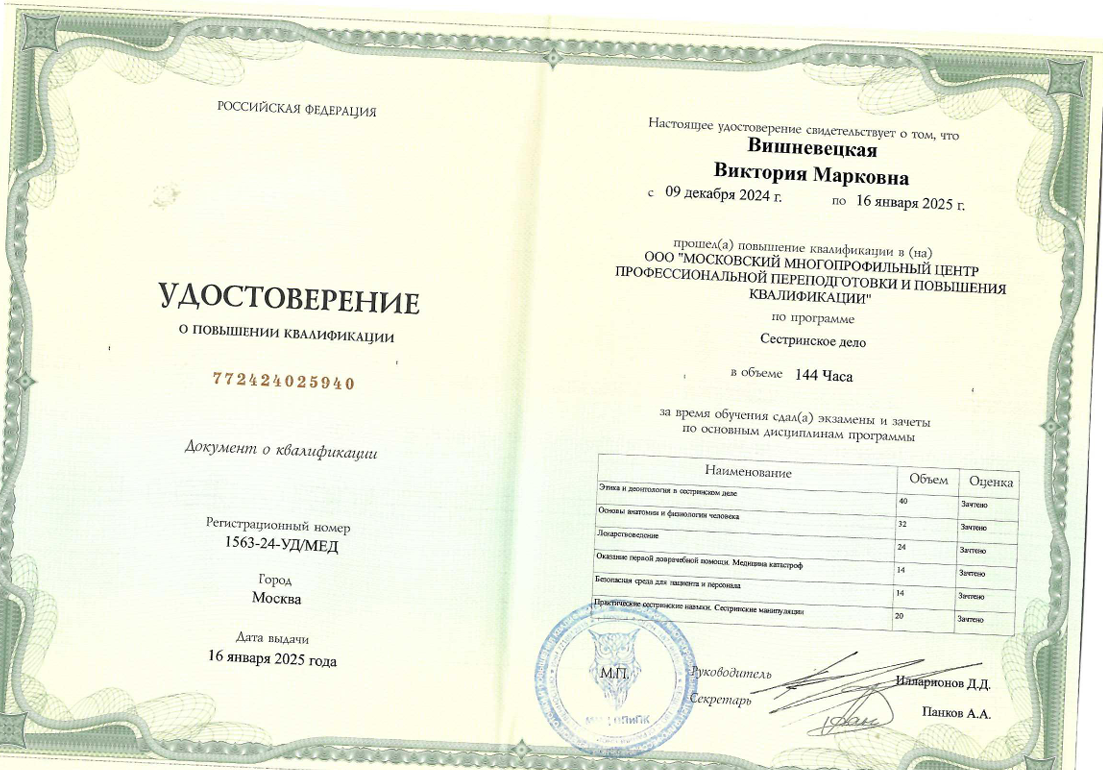 - Повышение квалификации по специальности «Сестринское дело», 2025.
