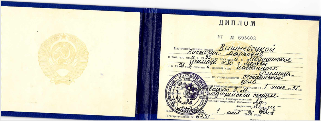 - Медицинское училище №30 г. Москвы, специальность «Сестринское дело», 1995.